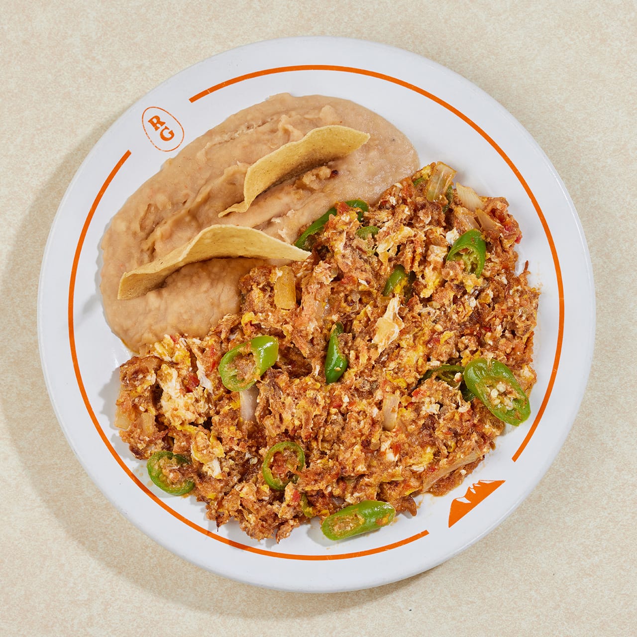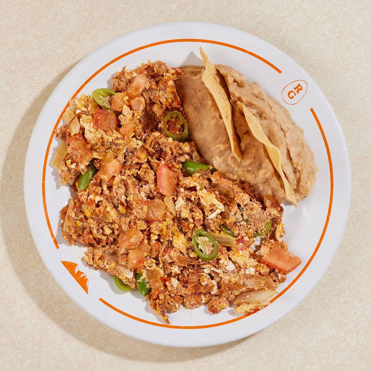 Carne seca guisada, sazonada con salsa, chile serrano, tomate, cebolla y revuelta con huevo.