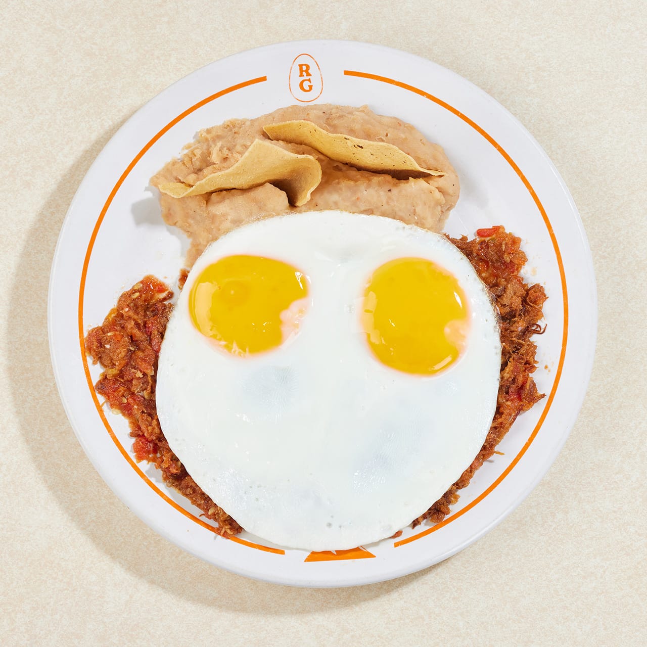 Carne seca guisada, sazonada con salsa, acompañada de dos huevos estrellados.