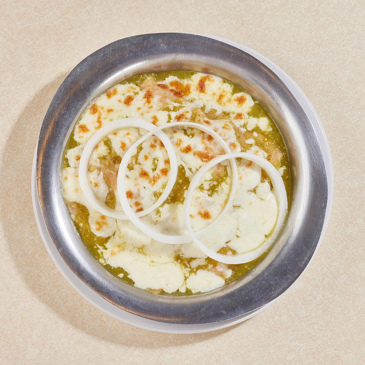Tortilla de maíz con machacado con huevo, bañado en salsa verde y frijol, gratinados.