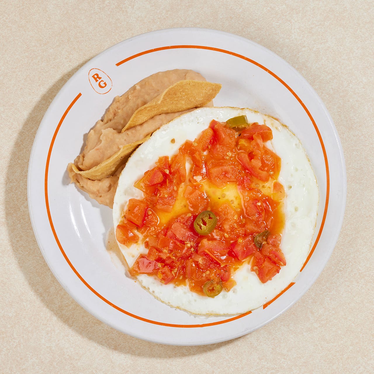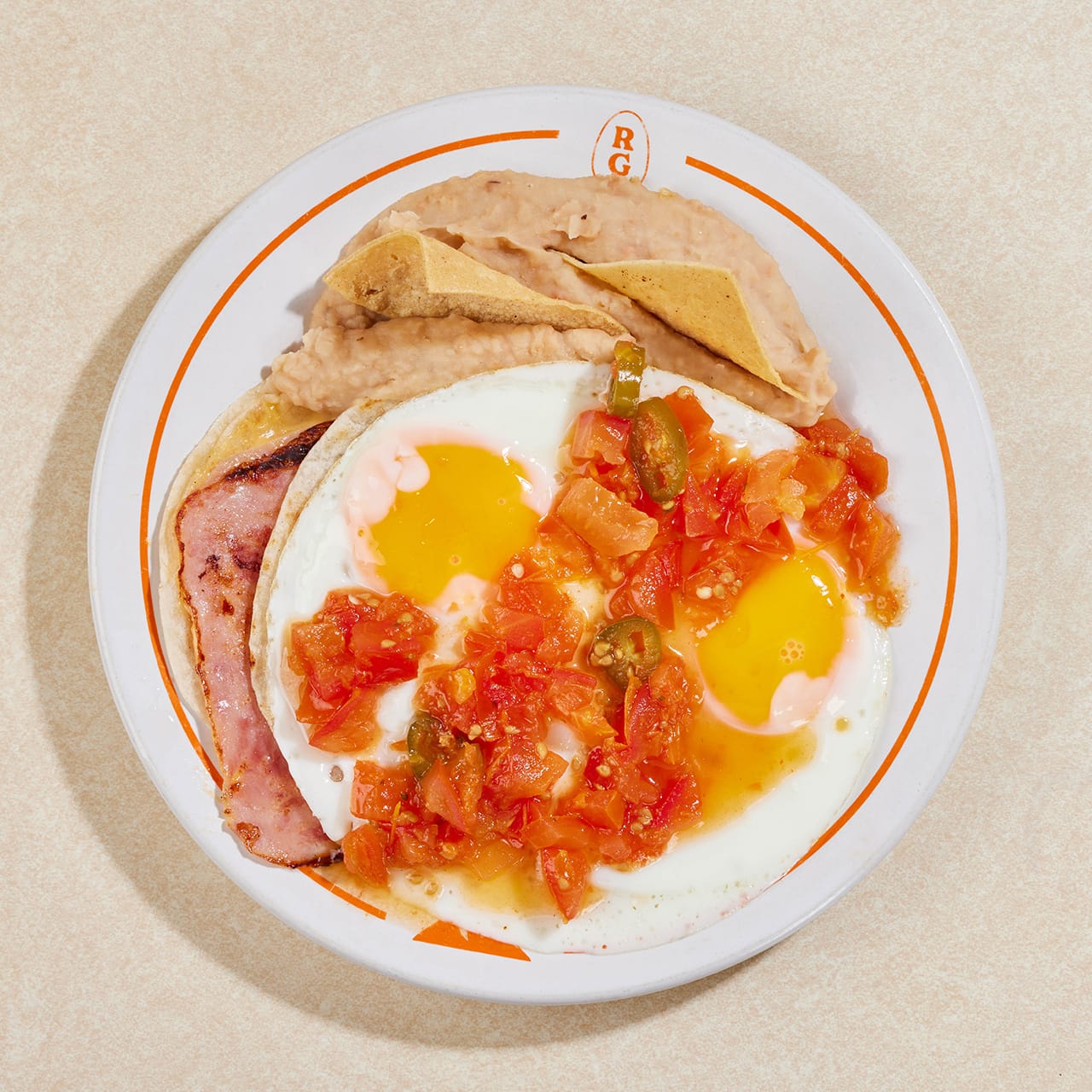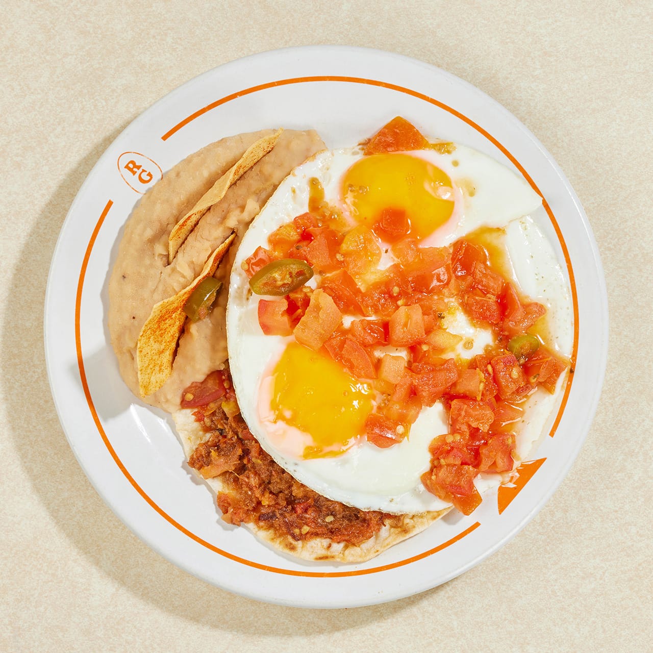 Dos huevos estrellados rancheros, sobre una sincronizada de atropellado y frijoles en maíz.