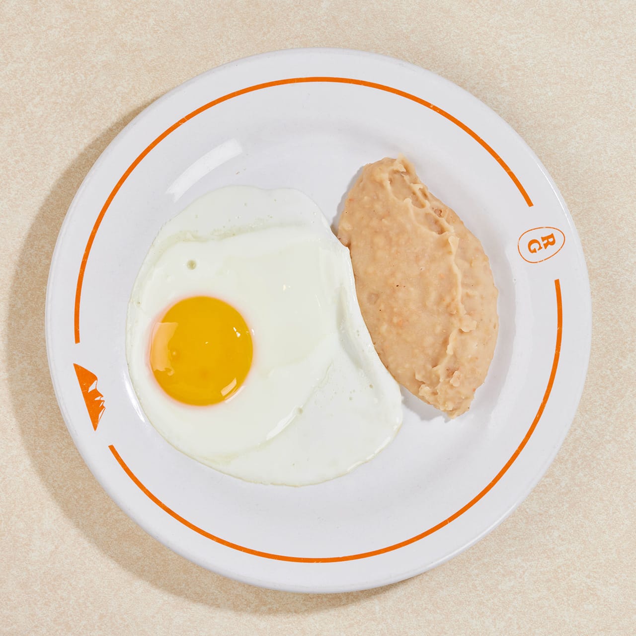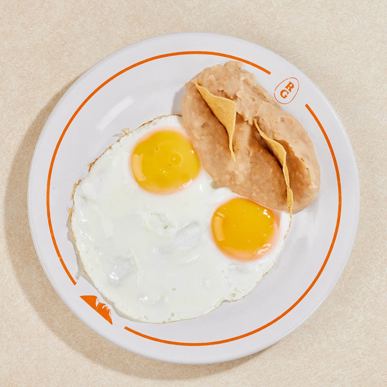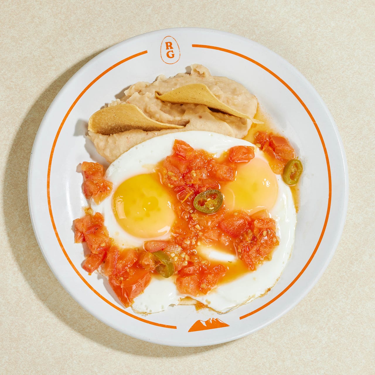 Dos huevos estrellados rancheros, sobre una sincronizada de atropellado y frijoles en maíz.