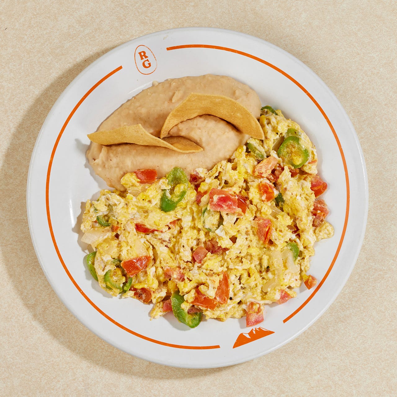 Dos huevos revueltos con salsa ranchera.
