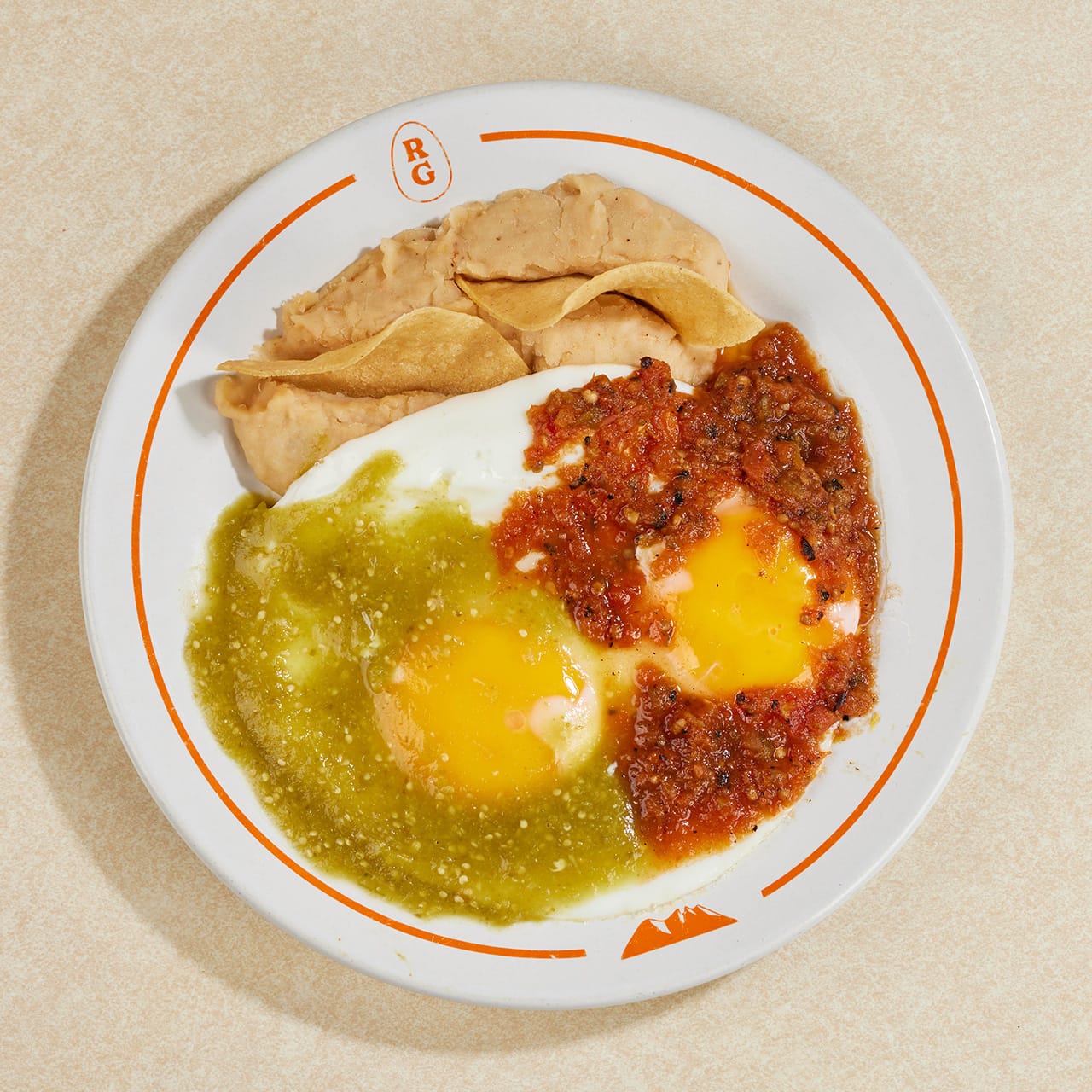 Dos huevos estrellados en salsa verde y salsa ranchera.