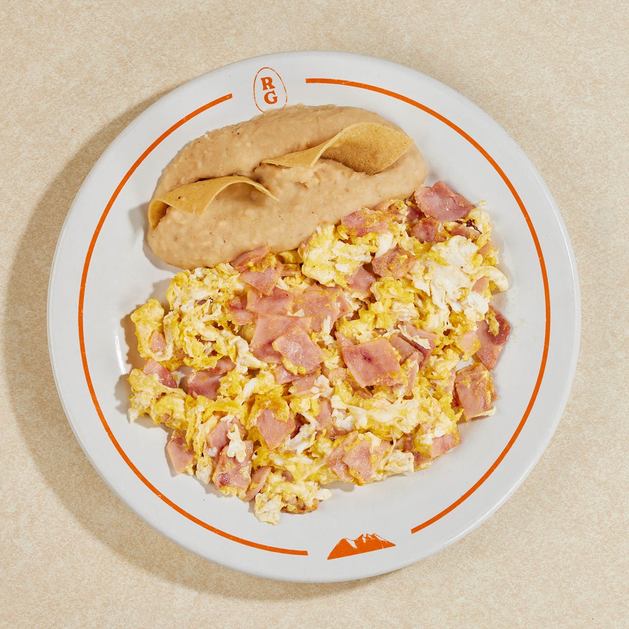 Dos huevos revueltos o estrellados, acompañados con jamón.