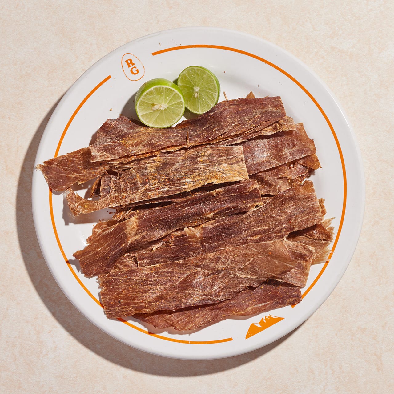 Tiritas crujientes de carne seca sazonada con chile en polvo.